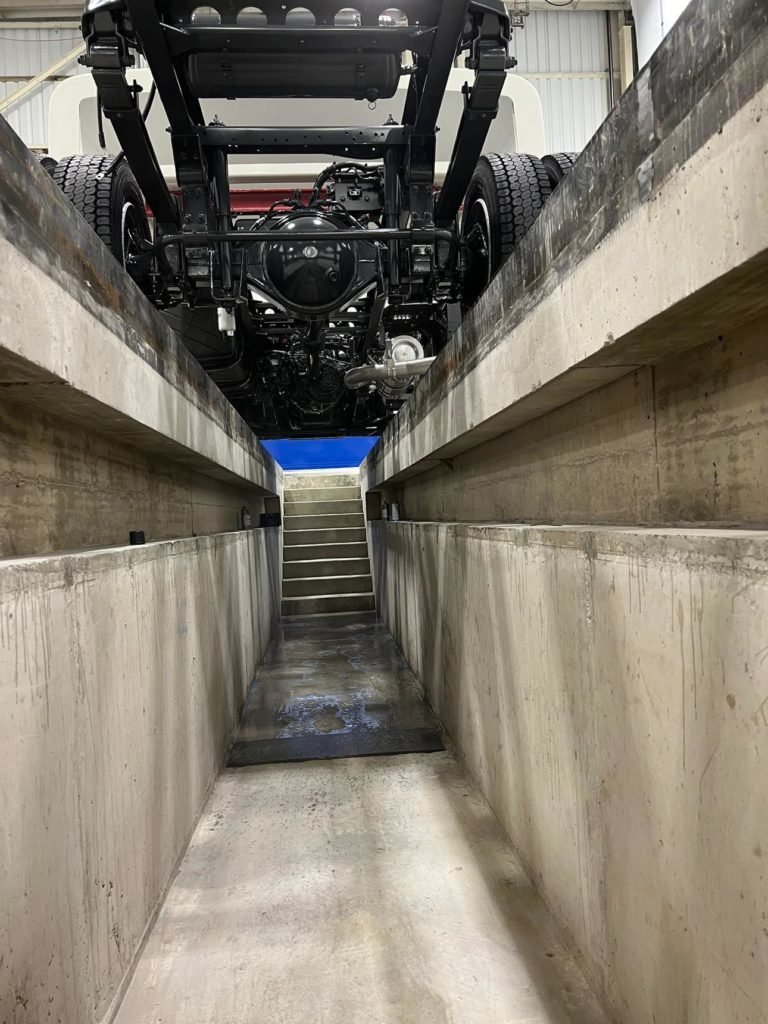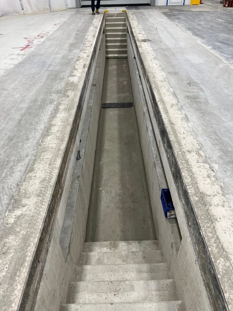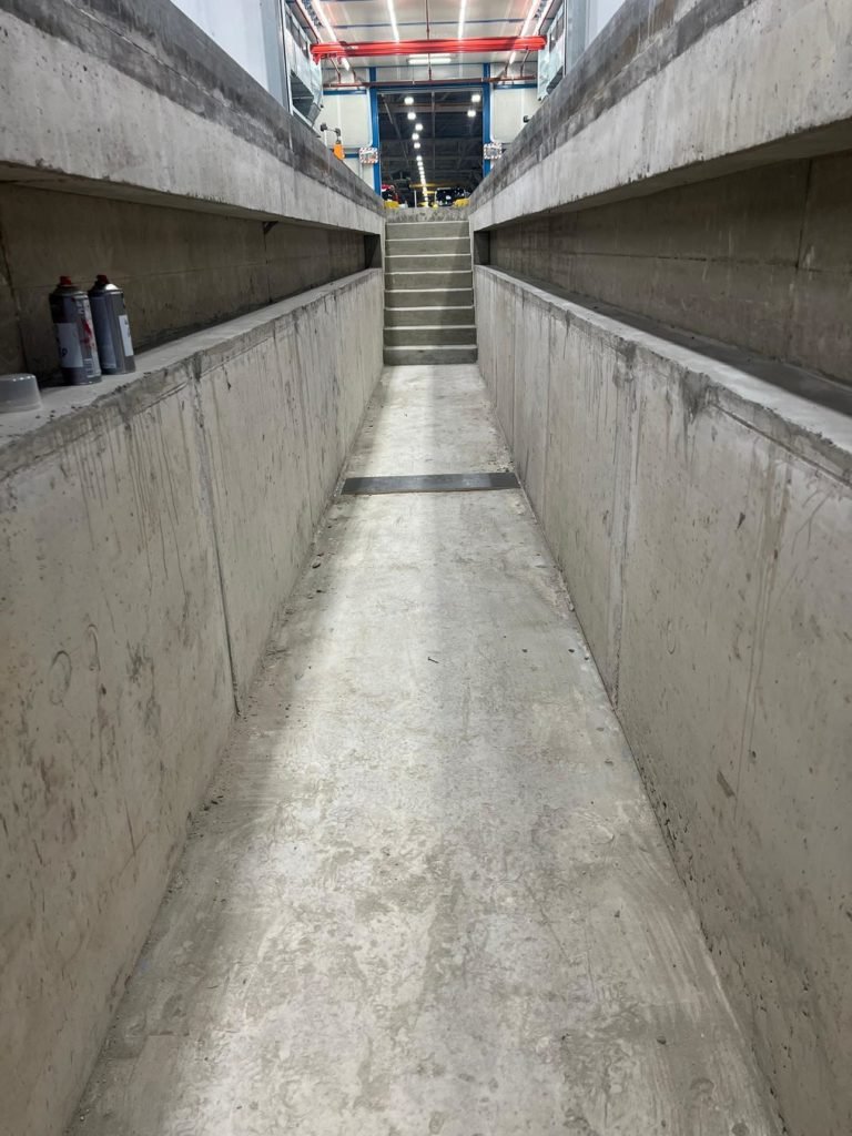 • Varied Pit Design: The project included three large pits to accommodate hidden truck brake testing equipment and two smaller inspection pits, each requiring tailored waterproofing treatments.